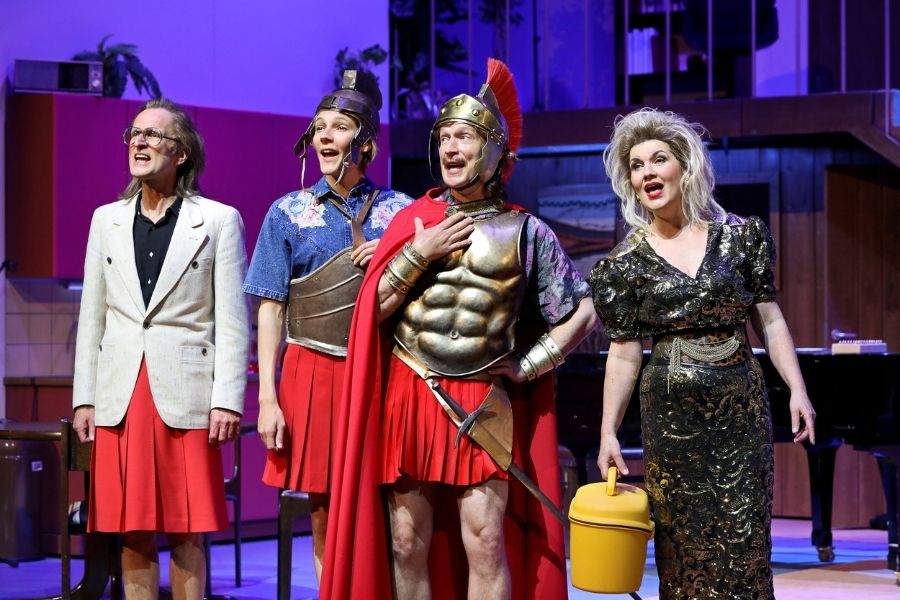 Der Regisseur Sienknecht spielt selbst mit großer Selbstironie Ventidius, den Legat von Rom, der Tusnelda die blonde Locke stibitzt. Auch Michael Lippold, Dominik Dos-Reis und Naruzs Huth verkörpern mit viel Witz sowohl Römer als auch Germanen, spielen verschiedene Instrumente und singen gekonnt. Dieser charmant-persiflierende Musiktheaterabend, der an Sitcoms der 80er/90er Jahre erinnert, ist einfach ein bisschen schräg. Trotz aller Komik endet der Abend aber mit einer mehr als aktuellen Botschaft: "It is time for peace, I swear, it is not zu late."